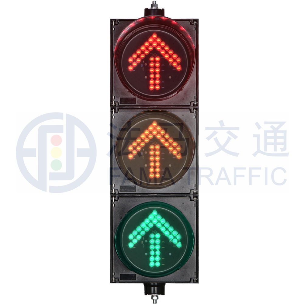 由红色、黄色、绿色3个几何位置分立的内有同向箭头图案的圆形单元组成,用于指挥某一方向机动车通行。箭头方向向左、向上、向右和掉头分别代表左转、直行、右转和掉头。针对特殊情况下的多方向组合控制需求,可考虑将方向指示灯根据实际需求进行组合应用,如直左、直右信号灯,信号灯的使用须与地面交通标线相匹配。