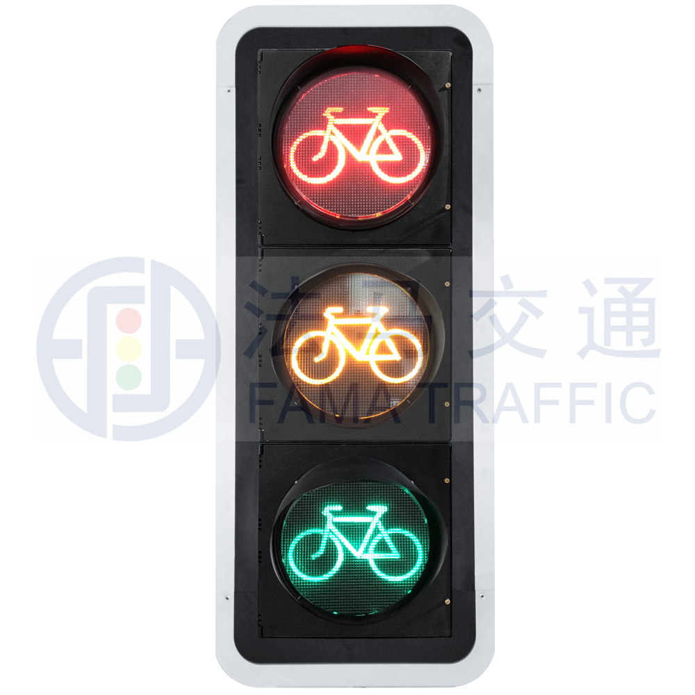 由红色、黄色、绿色3个几何位置分立的内有自行车图案的圆形单元组成,用于指挥非机动车通行,红灯表示禁止通行,绿灯表示准许通行,黄灯表示警示。